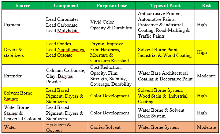 In Figure: 02, Kangaroo (Imported Brand) yellow paint was found to contain 190,000 ppm of lead—an alarming 2,111 times higher than the BSTI legal limit of 90 ppm. Other brands such as Jhumur (White: 9500 ppm), 777(Tangerine: 6700 ppm), Rauza (Mid Green: 6200 ppm), Anchor Premium (Red Oxide: 4800 ppm), and Penguin (Pink: 1700 ppm) show lead levels that are extremely high compared to the standard legal limit. All are solvent-based decorative paints except for Penguin, which is a spray paint. Bright shades such as Yellow, Red, Tangerine, and Green contain exponentially higher lead content compared to lighter tones. Yellow and orange paints are strongly associated with lead chromate pigments, while green and blue paints often contain lead oxide chromate. These pigments are commonly used in solvent-based formulations. Red paints typically contain lead molybdate pigments or employ lead dryers such as lead naphthenate, which are added to enhance vibrancy and durability.